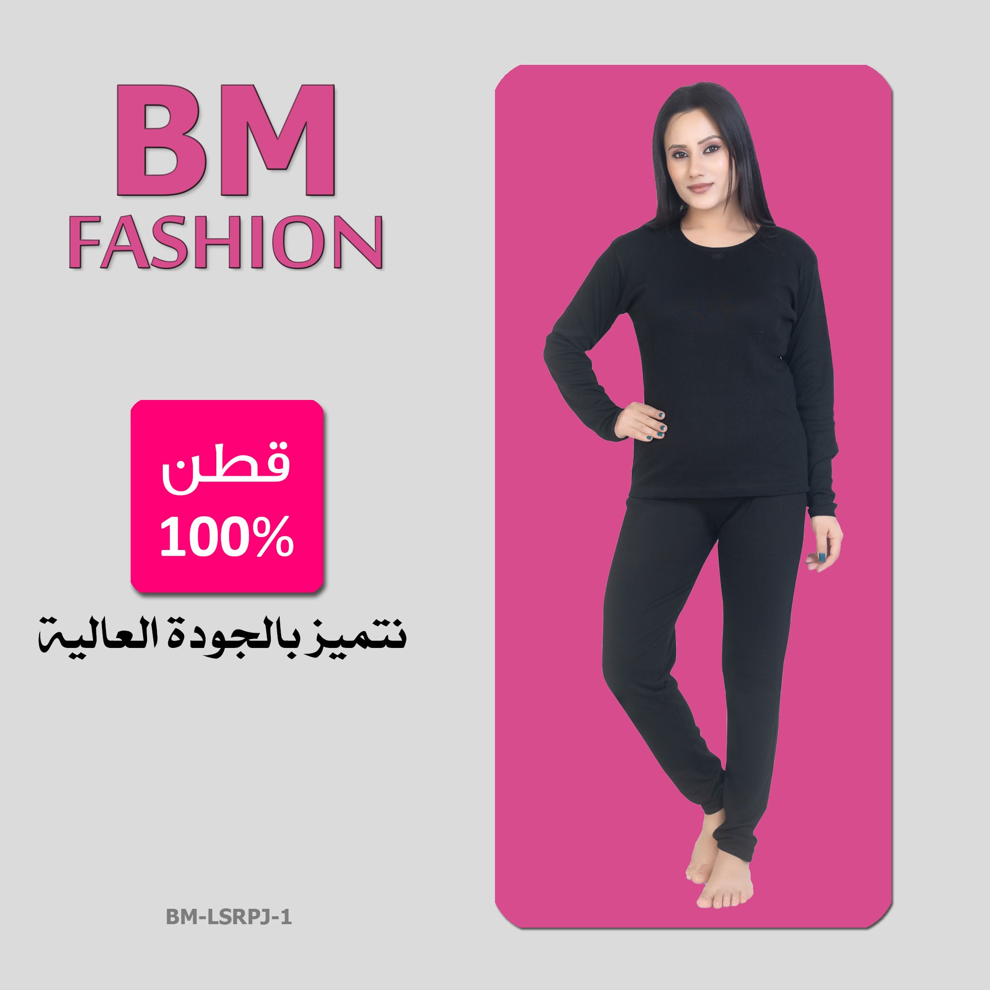 طقم داخلي نسائي سادة، شتوي بياقة دائرية عليها وردة ناعمة، كم طويل، مصنوع من القطن الآمن على البشرة، أكمام مريحة و خامة الطقم سادة، مثالي لـ اللبس تحت البيجامات او الملابس اليومية، و ملابس النوم، يمنح الراحة و الدفئ - لون أسود.