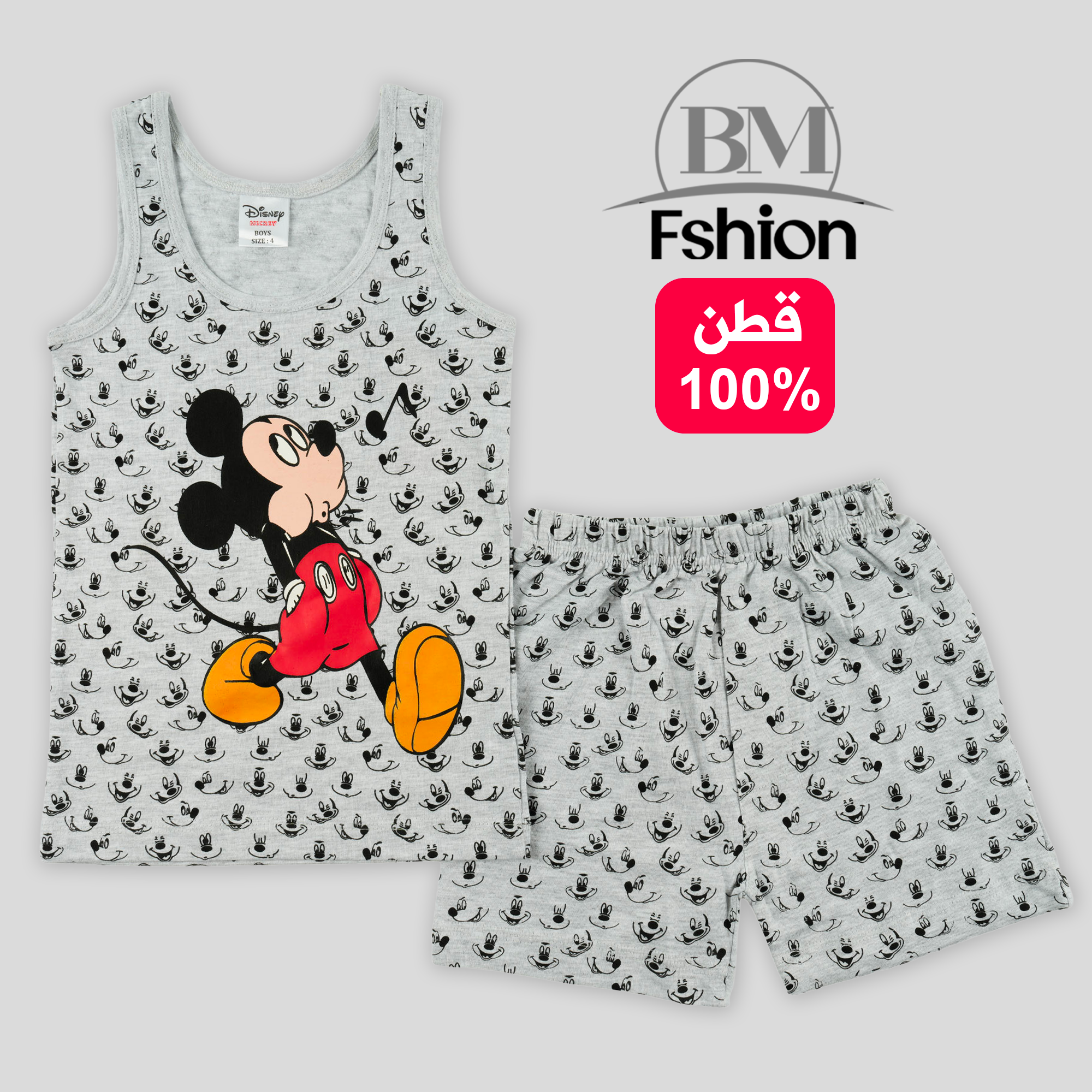 طقم شورت و فانيلا ولادي حفر صيفي برسومات، مصنوع من القطن، لون رمادي