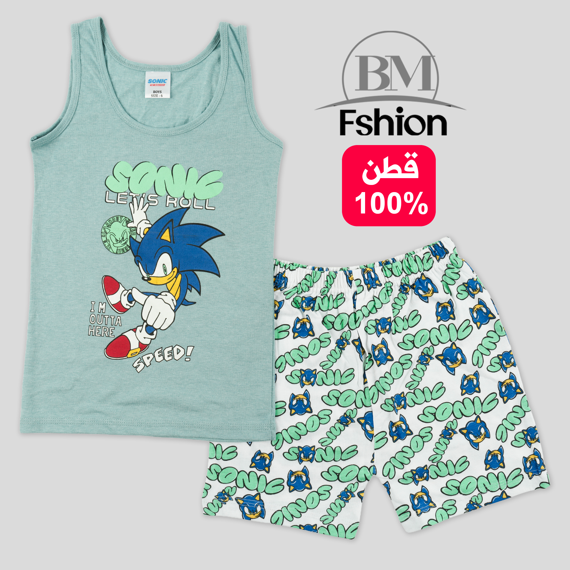 طقم شورت و فانيلا ولادي حفر صيفي برسومات، مصنوع من القطن، أزرق مائل للرمادي