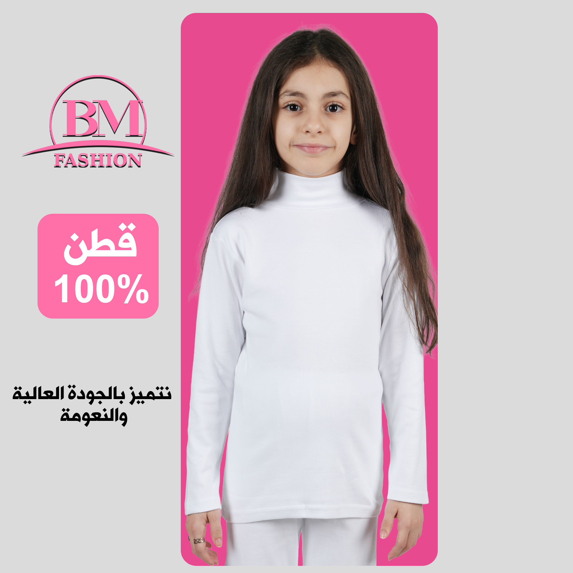 بلوزة شتوية بناتية برقبة (نصف عالية) ذات أكمام طويلة و مصنوعة من القطن، لون أبيض