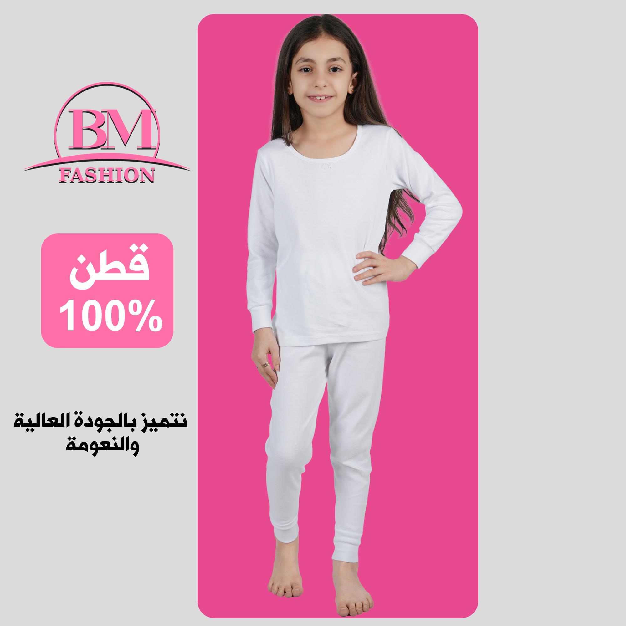 طقم داخلي بناتي سادة شتوي بياقة دائرية عليها وردتين ، كم طويل مصنوع من القطن الآمن على بشرة الأطفال مع كبكات لأطراف الأكمام و البنطلون لثبات أفضل، سادة، مثالي للبس تحت البيجامات او الملابس اليومية، يمنح الراحة و الدفئ للأطفال - لون أبيض .