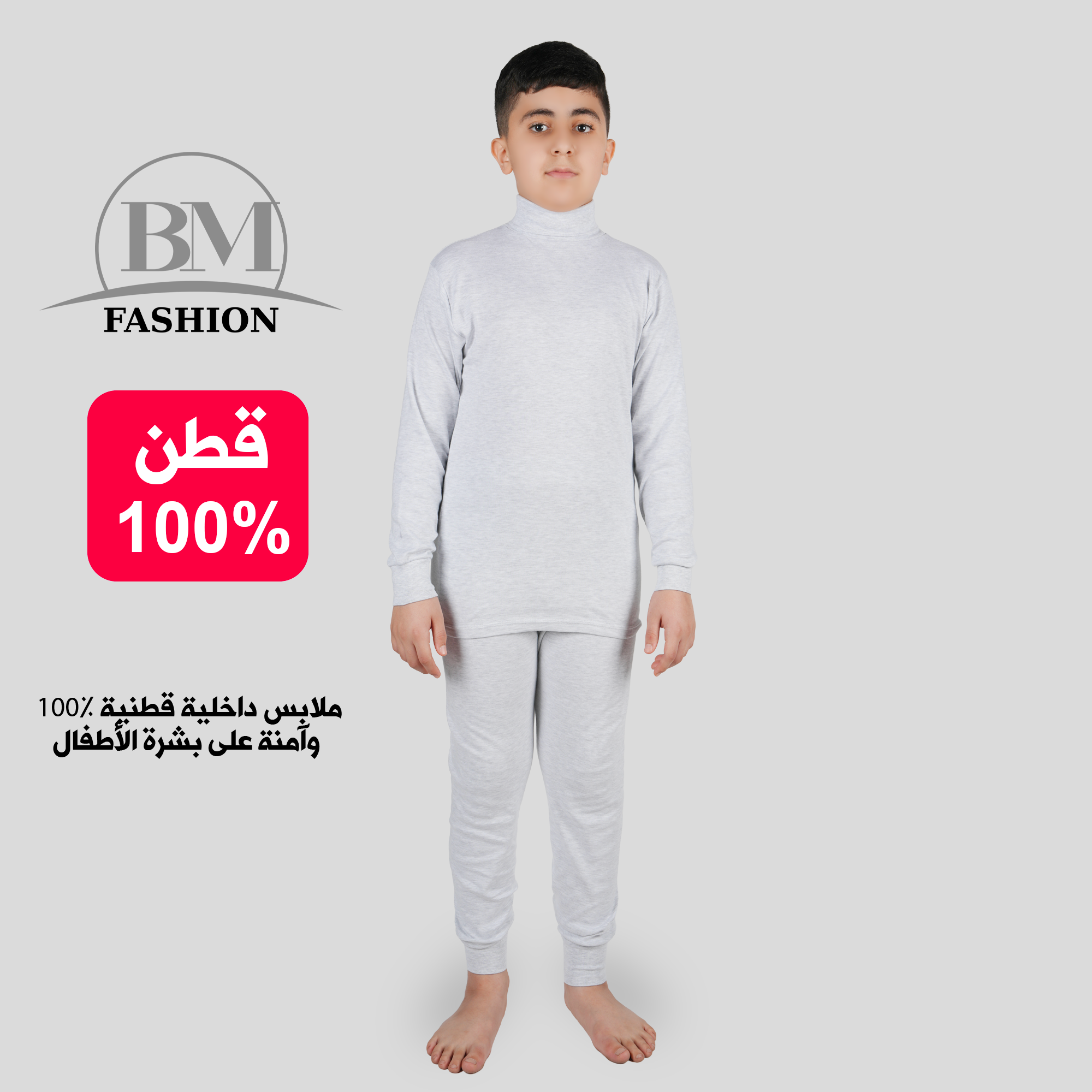 طقم داخلي ولادي كم طويل رقبة طويلة سادة مصنوع من القطن و بلون رمادي فاتح.