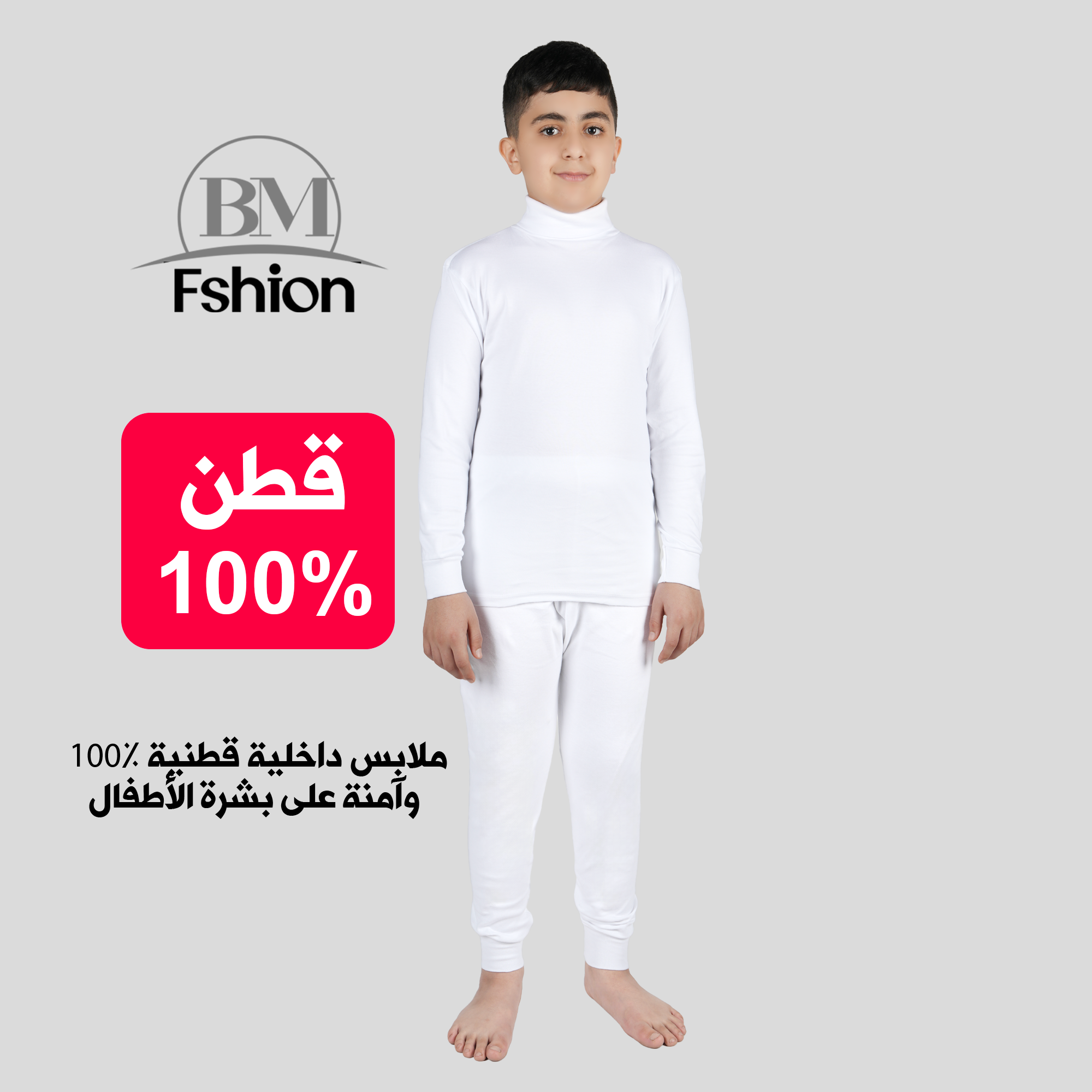 طقم داخلي ولادي كم طويل رقبة طويلة سادة مصنوع من القطن و بلون أبيض.