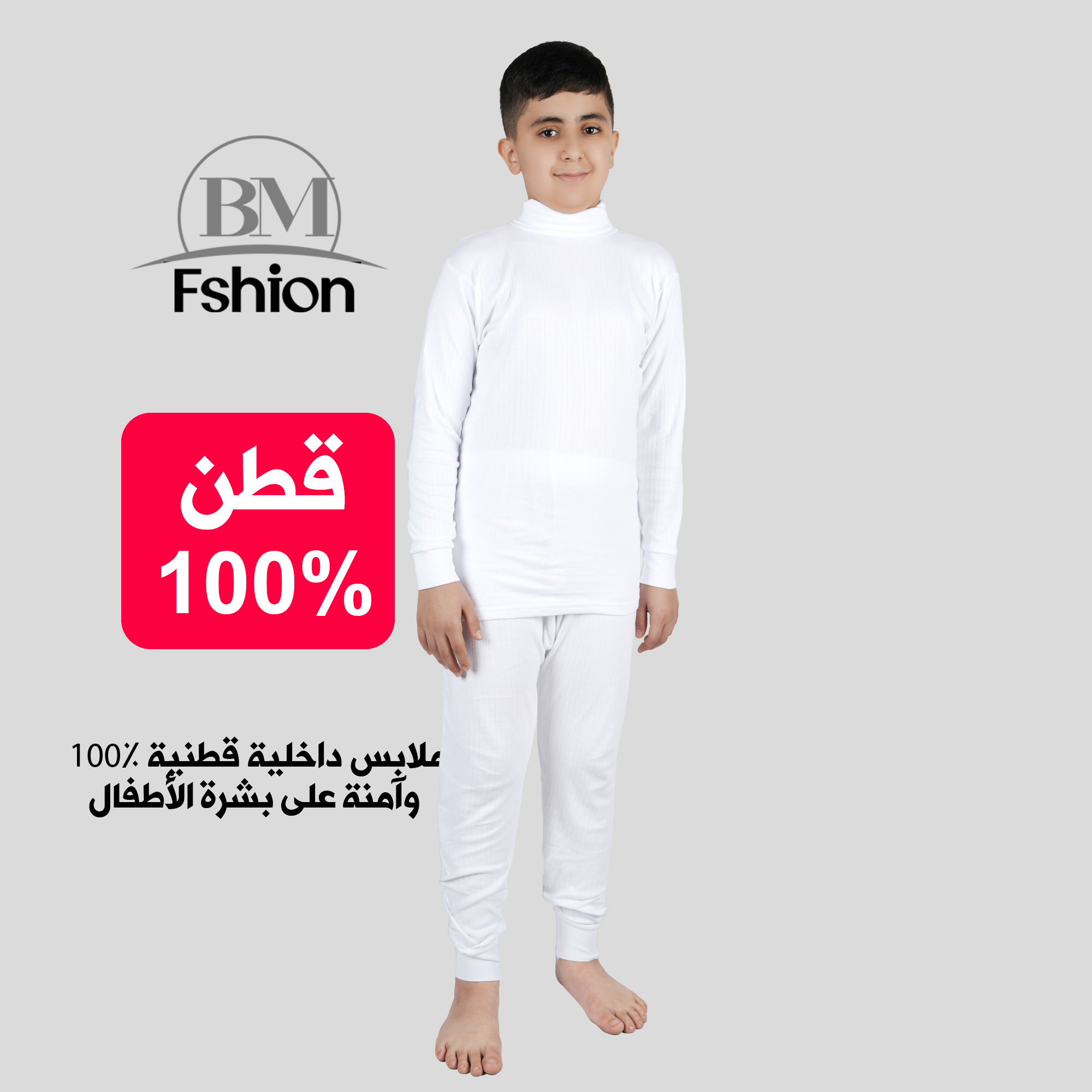 طقم داخلي ولادي كم طويل رقبة طويلة مقلم مصنوع من القطن و بلون أبيض.
