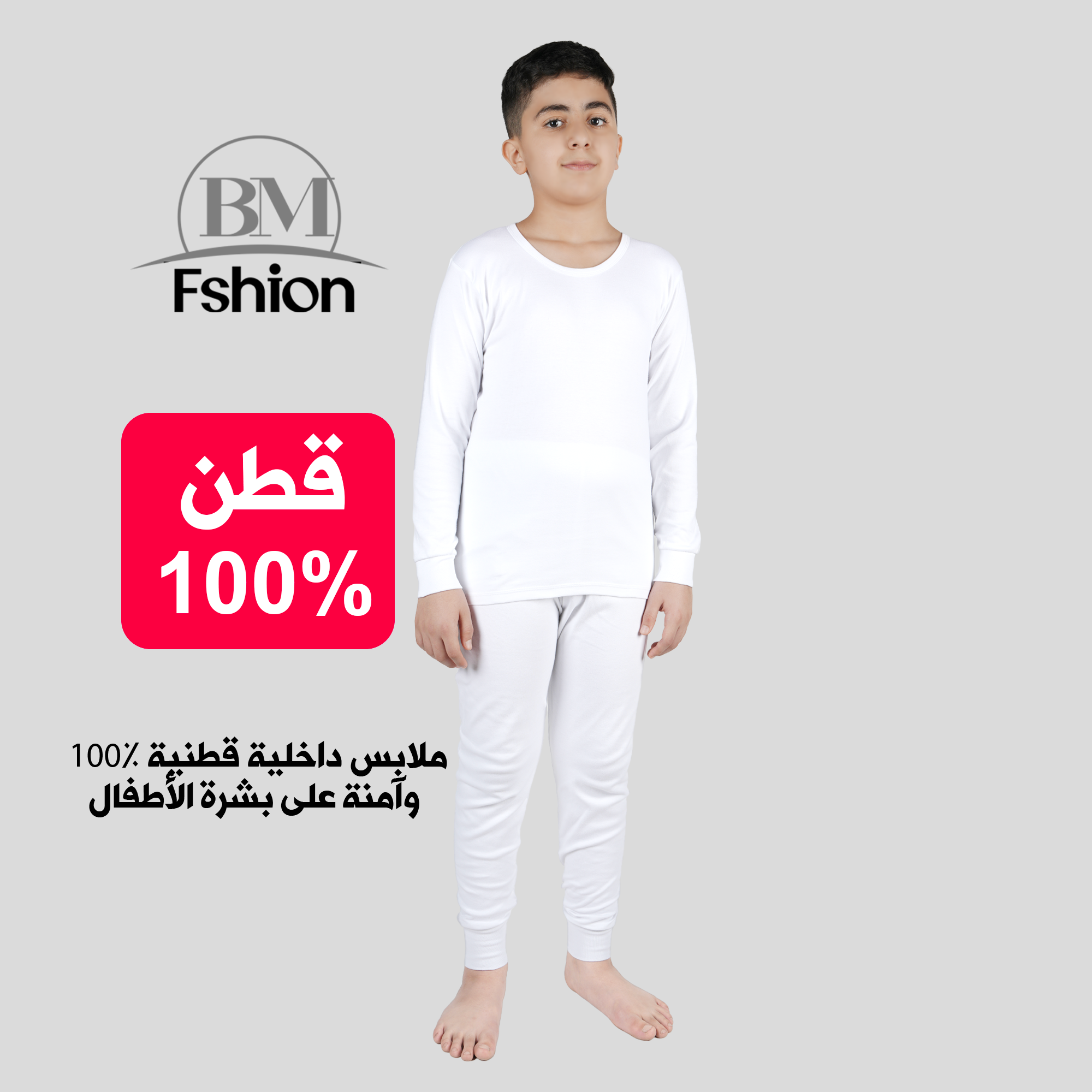 طقم داخلي ولادي مقلم شتوي بياقة دائرية و كم طويل مصنوع من القطن الآمن على بشرة الأطفال مع كبكات لاطراف الاكمام و البنطلون لثبات أفضل، سادة، مثالي للبس تحت البيجامات او الملابس اليومية، يمنح الراحة و الدفئ للأطفال - لون أبيض.