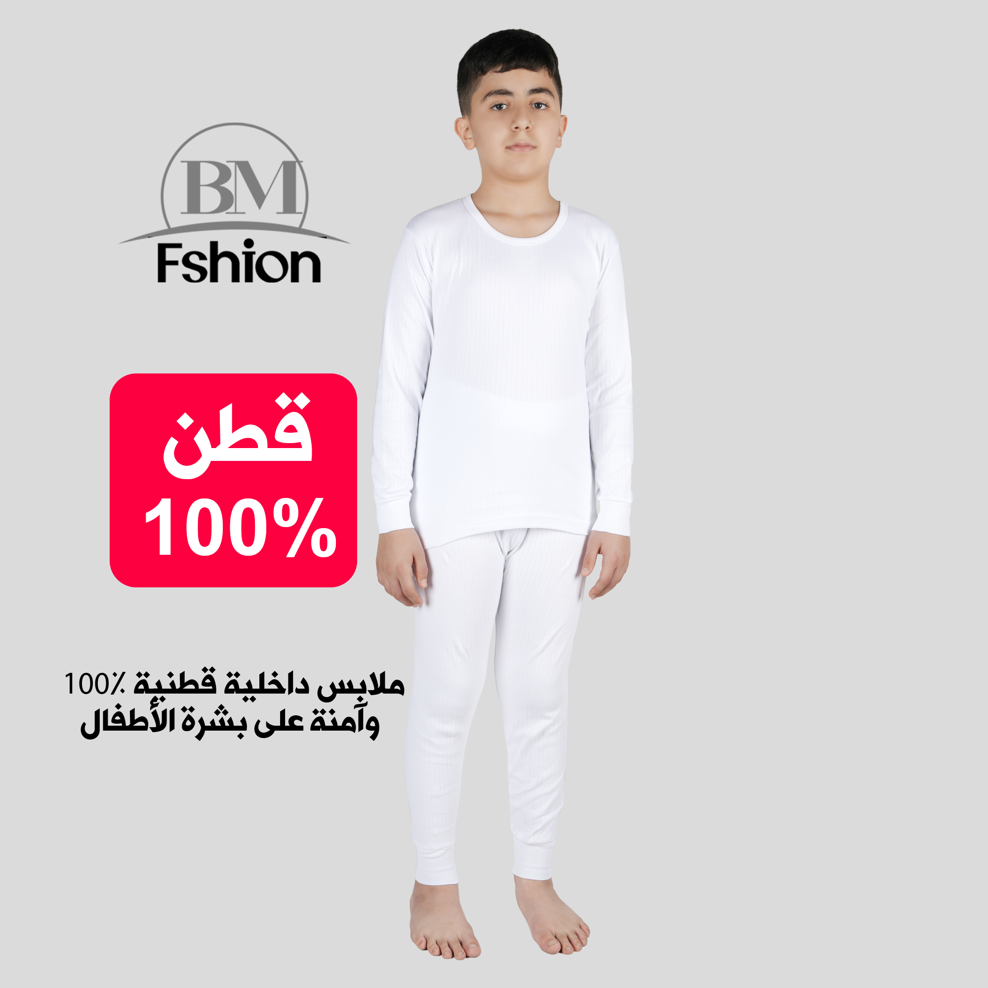 طقم داخلي ولادي مقلم شتوي بياقة دائرية و كم طويل مصنوع من القطن الآمن على بشرة الأطفال مع كبكات لاطراف الاكمام و البنطلون لثبات أفضل، مُقلم، مثالي للبس تحت البيجامات او الملابس اليومية، يمنح الراحة و الدفئ للأطفال - لون أبيض .