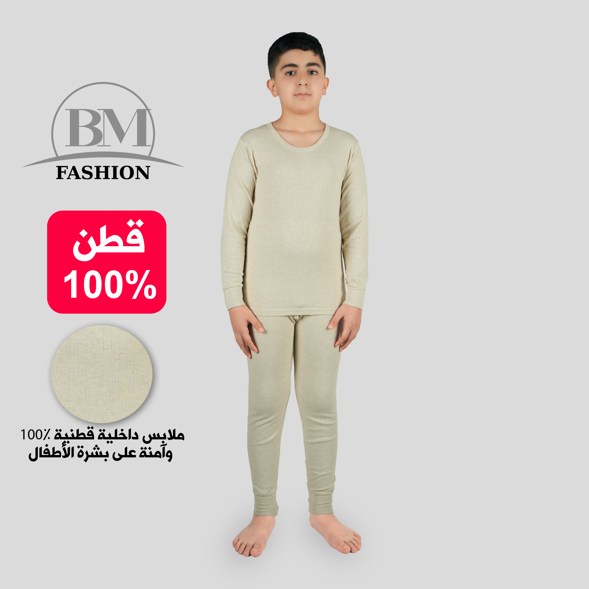 طقم داخلي ولادي مقلم شتوي بياقة دائرية و كم طويل مصنوع من القطن الآمن على بشرة الأطفال مع كبكات لاطراف الاكمام و البنطلون لثبات أفضل، مُقلم، مثالي للبس تحت البيجامات او الملابس اليومية، يمنح الراحة و الدفئ للأطفال - لون بيج .